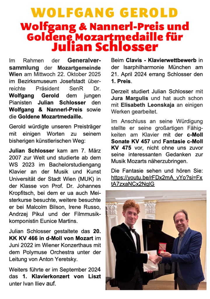 Bei der Generalversammlung der Mozartgemeinde Wien am 22.10.2025, traditionell im Bezirksmuseum Josefstadt, wurde JULIAN SCHLOSSER mit dem WOLFGANG & NANNERL-PREIS und der Goldenen Mozartmedaille geehrt, letztere erhielt auch unser Vorstandsmitglied CHARLOTTE LEITNER, die sich mit einem musikalischen Spaß mit Mozartlieder bedankte (https://youtu.be/c7MUOZ7Y6T0). Julian Schlosser spielte die c-Moll Sonate KV 457 (https://youtu.be/QHznyTXEOko) und Fantasie c-Moll KV 475 (https://youtu.be/rFDx2mA_vYo).